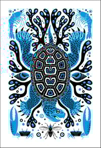 Part of the Turtle Series. The beautiful Diamondback Terrapin is a threatened species, and is native to the salt marshes of the Eastern US. It's the only estuarine terrapin species in North America. Included in this print are the species that share this habitat: ghost shrimp, marsh perwinkle, bladderwrack, greenhead fly, and fiddler crab.