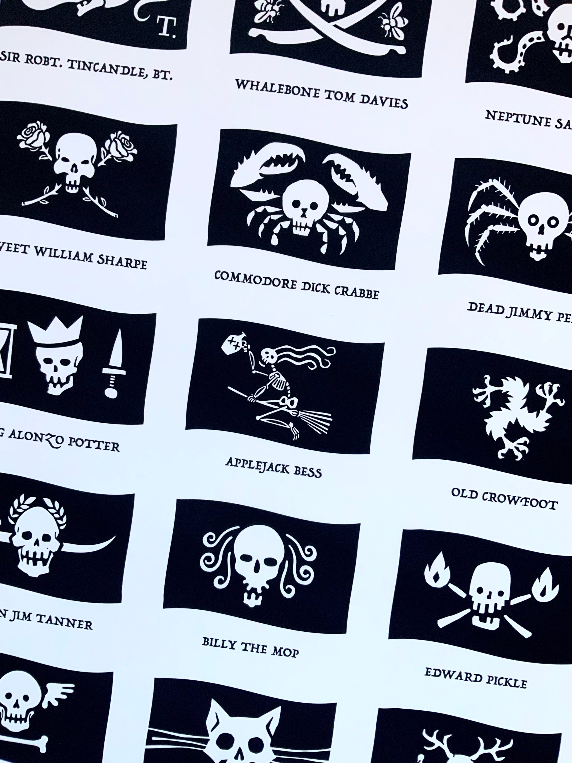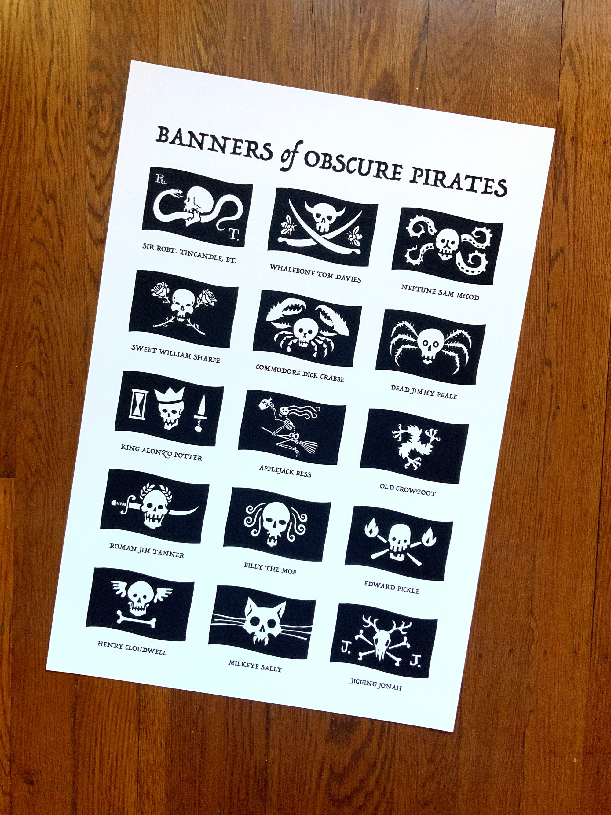 A fun little piece. Designs and names are fictional, but are based on the actual names and banners of famous 18C pirates. 13 x 19" giclee on archival paper.